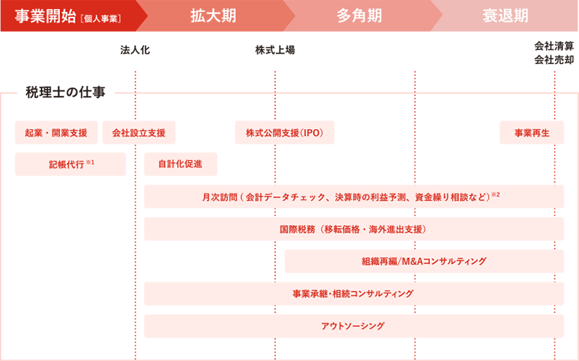 ビジネスの起業から始まり、経営者と一生涯のお付き合いをすることも珍しくありません。企業規模によっては、税理士は経営者の最も信頼できる身近な相談相手です。ビジネスの成長ステージに応じたサービスを提供し、経営者と共に成長していきます。
