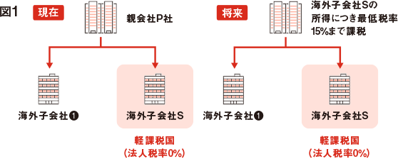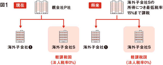 図1をご覧ください。海外に子会社をもつP社に法人税率0%の海外子会社S社があります。15%ルールが適用されると、S社の所得の15%相当額が、P社で課税されることになります。親会社は、海外子会社の税務情報をタイムリーに収集・分析し、その情報に基づき、申告・納税をする必要が生じるため、グローバルでの税務ガバナンスの強化を推進しています。